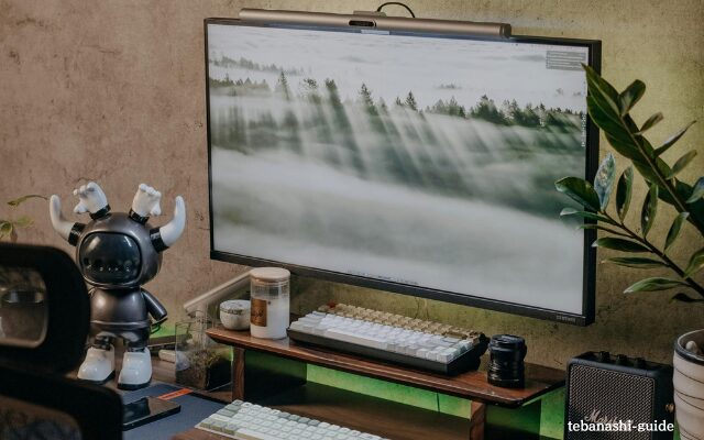 選ぶポイントは「色温度の調整機能」と「明るさの段階調節」があるかどうか。昼白色(5,000K前後)は集中したい作業向き、電球色(3,000K前後)はリラックスしたい夜間の読書向きです。BenQのスクリーンバーのようにモニター上部に取り付けるタイプなら、デスク上のスペースをまったく消費しません。
